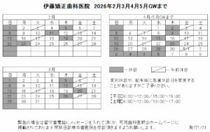 【診療カレンダー】26年2月~4月と、5月GWの診療日と休診日について 2025.07.28 こんにちは。 伊藤矯正歯科医院でございます。 診療カレンダーをご案内致します。 初診のご予約や次回のご予約の参考になさってください。