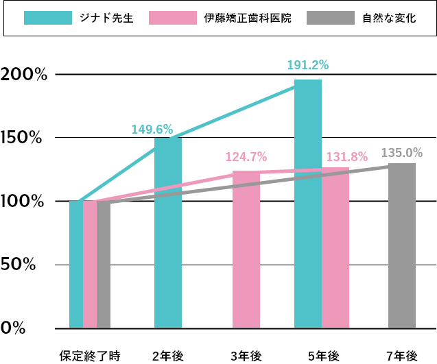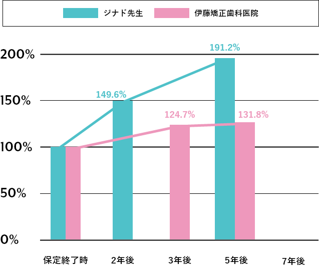 従来の矯正(ジナド先生の報告)と当院の矯正の調査法2)は少し異なるため、それぞれの保定終了時のスコアまたは指数を100%として、その後の変化を比較しました。