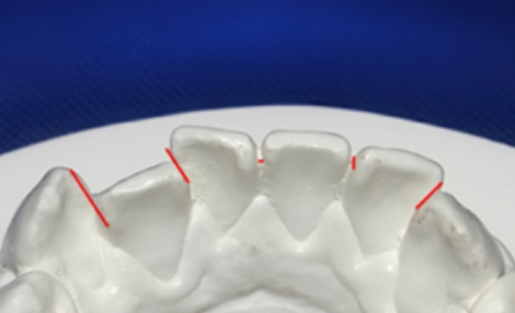 観察方法はPARスコアではなく、もう少しダイレクトな評価になるリトル教授らの方法を使いました。つまり右図のように、後戻りが一番現れやすいと言われている下の前歯において、歯と歯の接触点間の距離をmm単位でデジタル写真上で計測し、それらの合計のミリ数を「指数」とするものです。歯並びが綺麗であれば“0”に近い数字になり、数字が大きいと悪い歯並びを意味します。この写真の歯と歯の接触点間の距離の合計は9.3mmでしたから、指数は9.3になります。